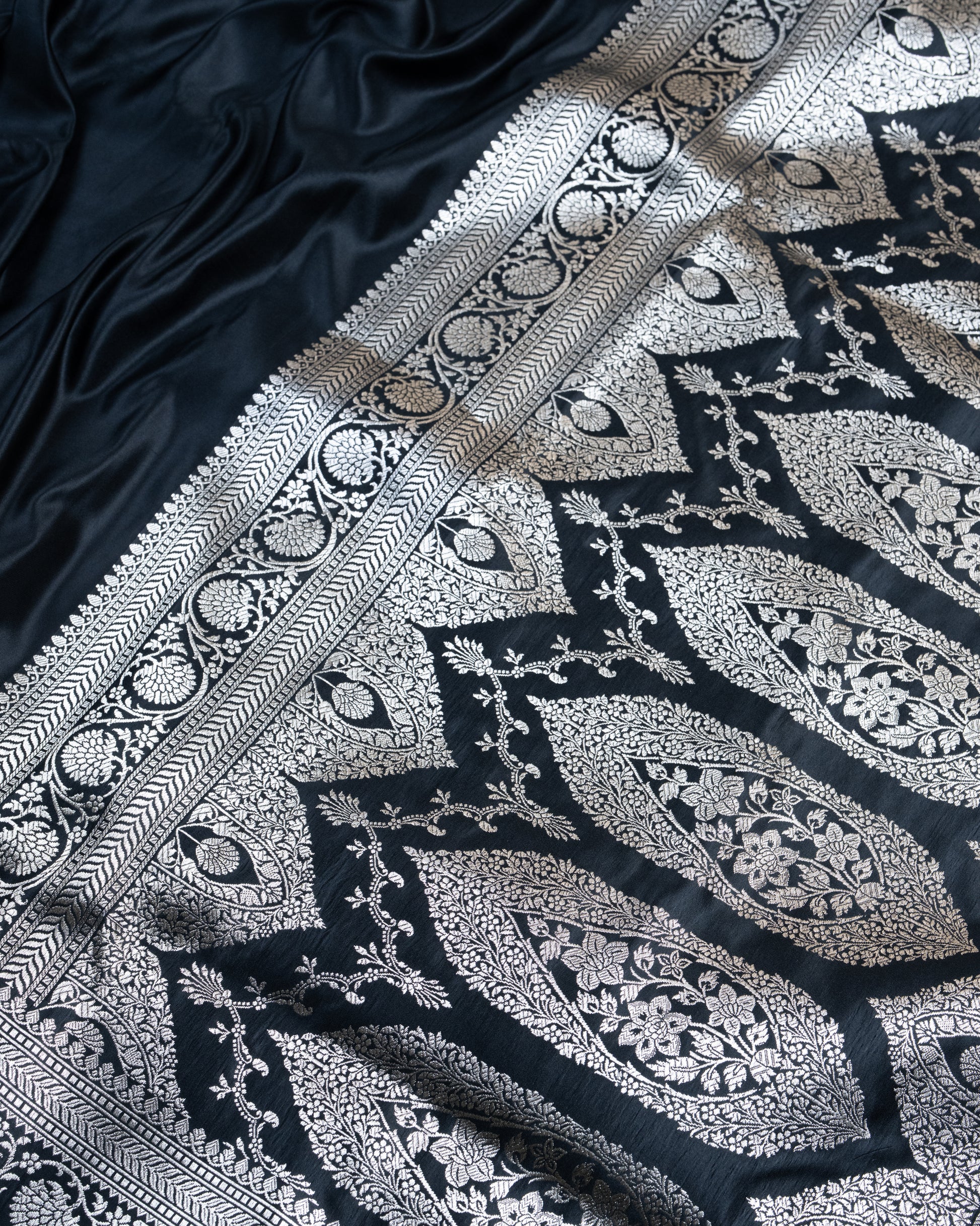 This gorgeous piece is a black Mashru Katan Silk Saree, intricately woven in traditional Banarasi style. Woven by skilled artisans, this saree exudes elegance and sophistication. Elevate any occasion with this timeless piece that is sure to turn heads and make you feel confident and radiant. It is so flowy and lightweight, the drape feels so effortless and comfortable.