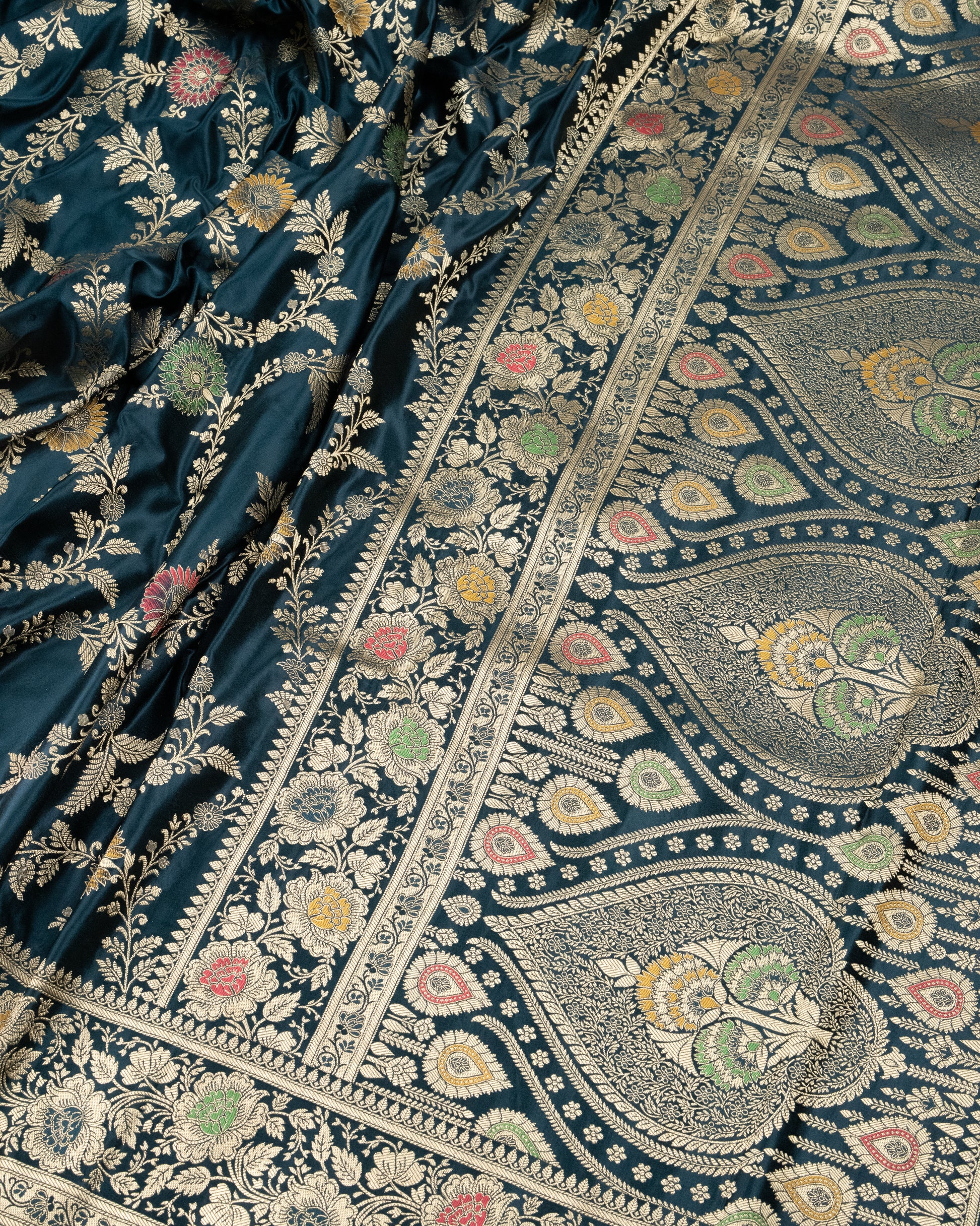This gorgeous piece is a bottle green Mashru Katan Silk Saree, intricately woven in traditional Banarasi style. Woven by skilled artisans, this saree exudes elegance and sophistication. Elevate any occasion with this timeless piece that is sure to turn heads and make you feel confident and radiant. It is so flowy and lightweight, the drape feels so effortless and comfortable.