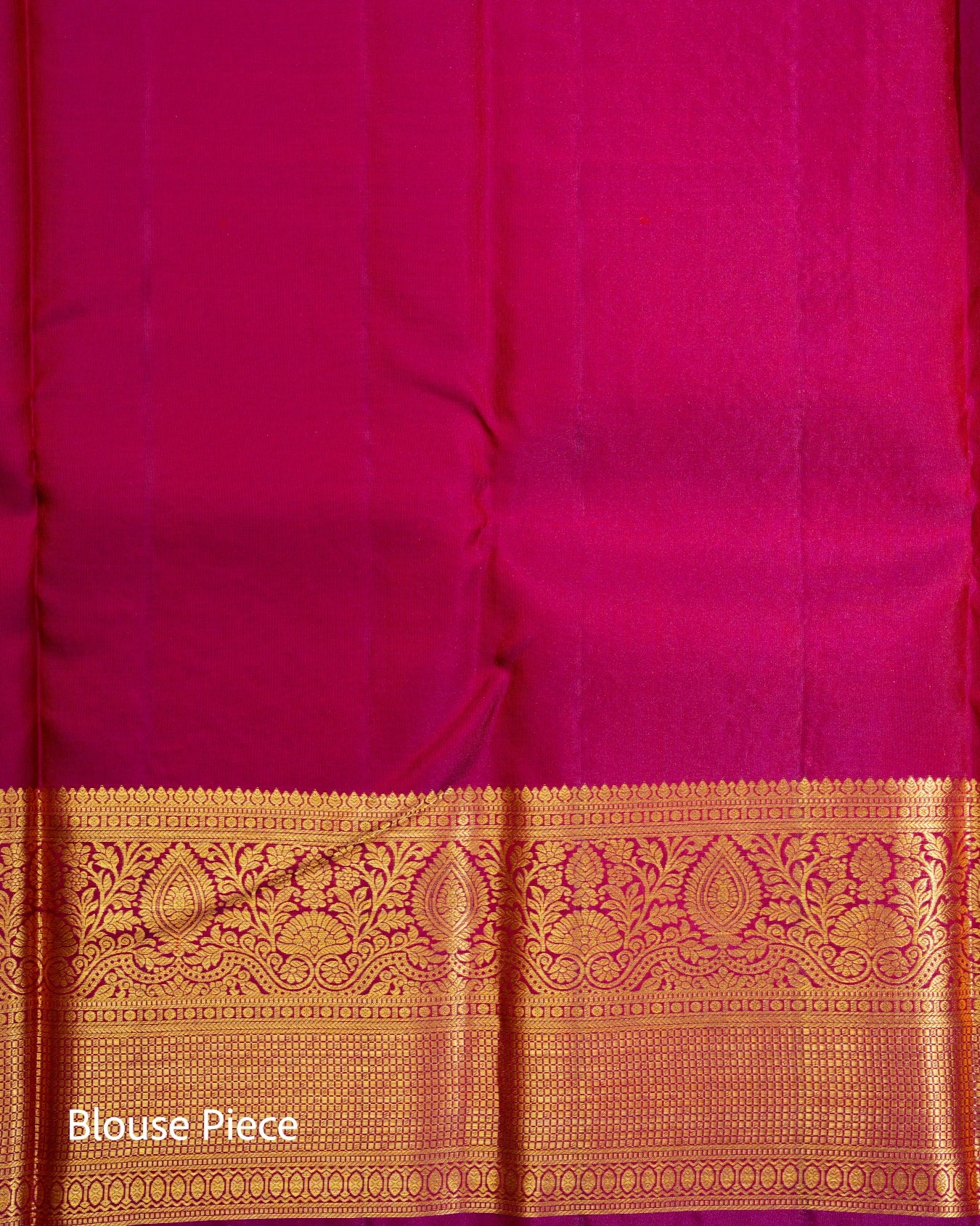 This exquisite Kanchipuram saree is handwoven by one of our master weavers. Renowned for its strength, lustre, and intricate craftsmanship, this saree embodies centuries of weaving heritage. The borders and grand pallu shimmer with pure zari, creating a stunning interplay of color and light that captures the essence of royalty.